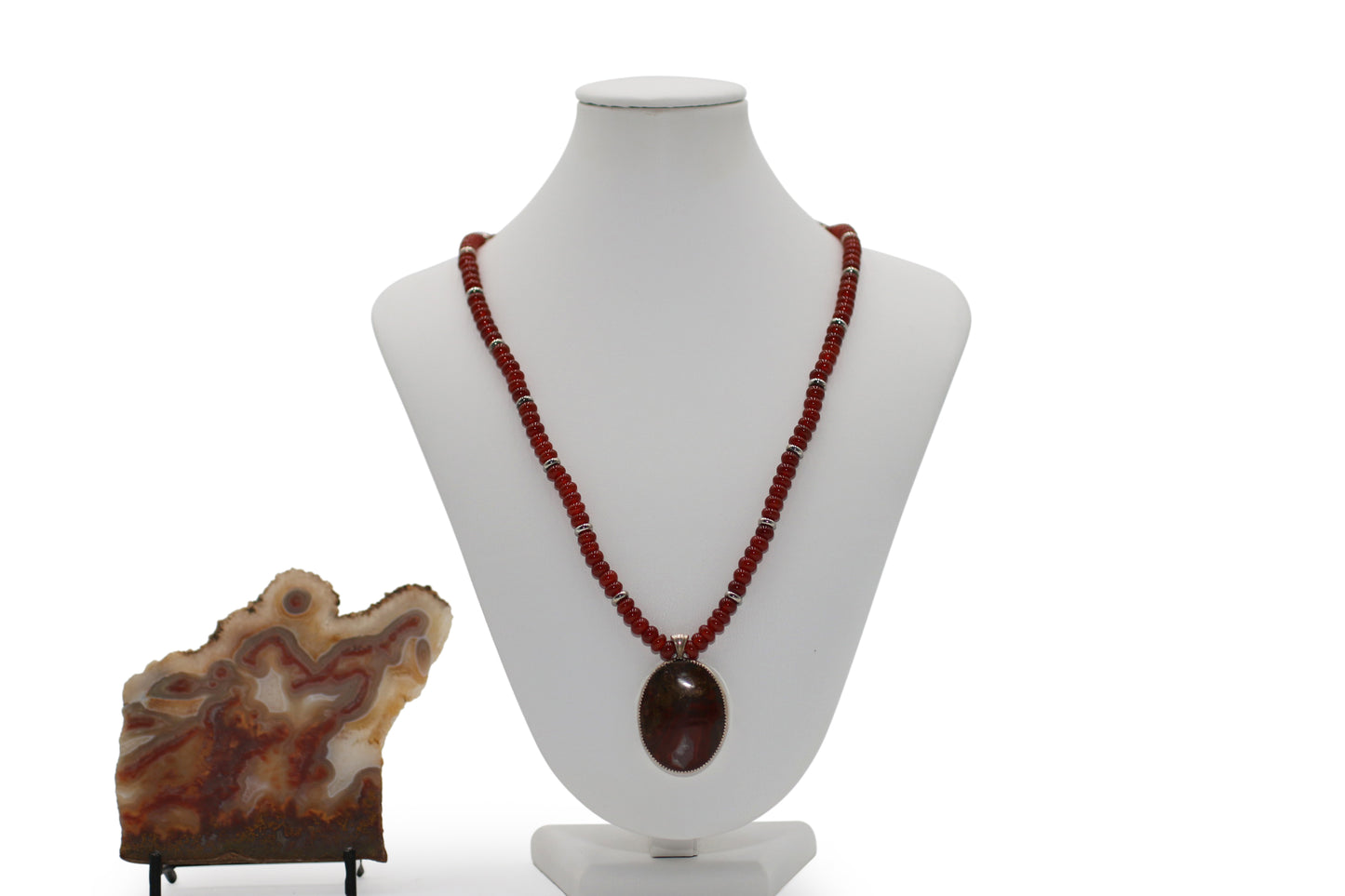 Discover West Texas in this stunning Brown\Red Agate Sterling Silver Silversmith Cabochon necklace, featuring a Quartz Crystal and Carnelian Natural Gemstones. Hand-cut and polished for a one-of-a-kind piece.