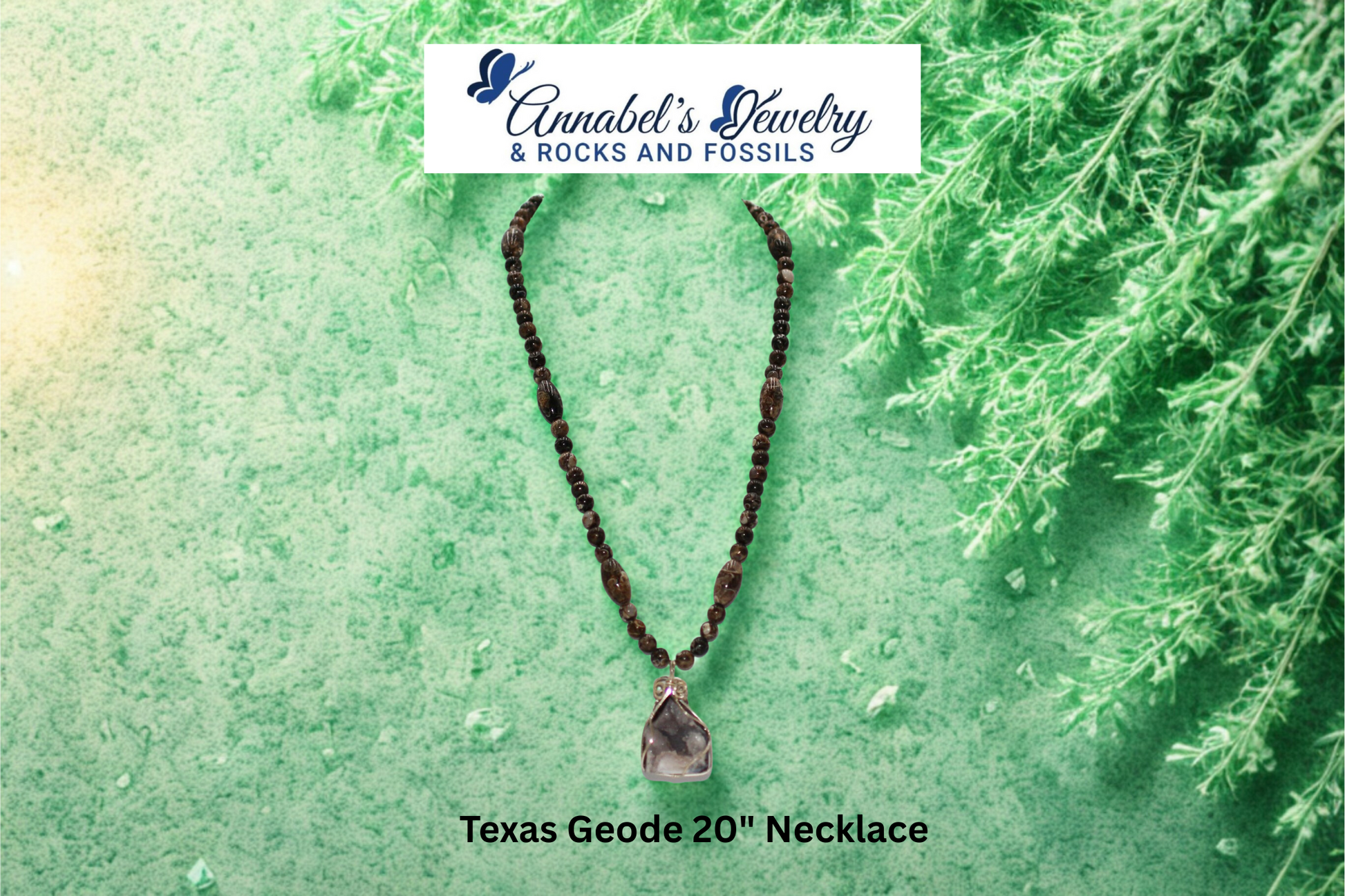 Luckenbach, Texas, a town known for its music, holds more than just good tunes. Our stunning Geode Pendant, featuring Turritella Fossils Natural Gemstones, showcases a geode found in the heart of this lively location. Caliche, a common material used for road improvements, was the key to finding this rare beauty. Each necklace is handcrafted with Sterling Silver wire and showcases the true uniqueness of this one-of-a-kind piece.