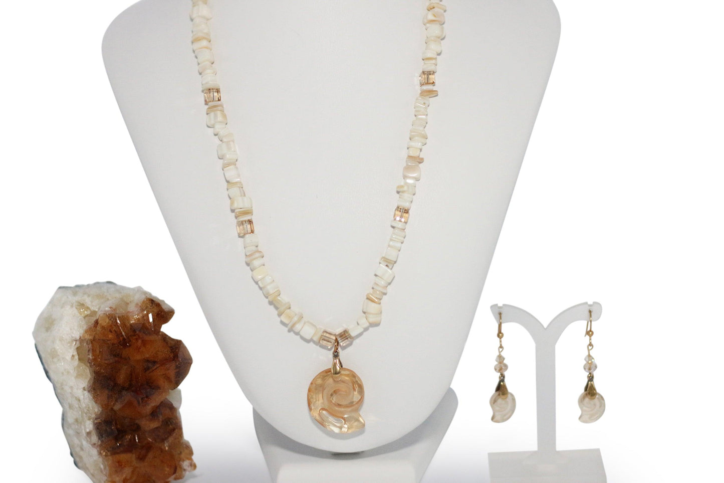 Indulge in the opulence of our Nautilus Golden Shadow Austrian Crystals set. Adorn yourself with a 20" necklace featuring shimmering gold filled components and a 3" extender chain. Complete the look with our matching fishhook earrings, featuring delicate rondelles and bails. Treat yourself to these luxurious pieces and elevate your style today.