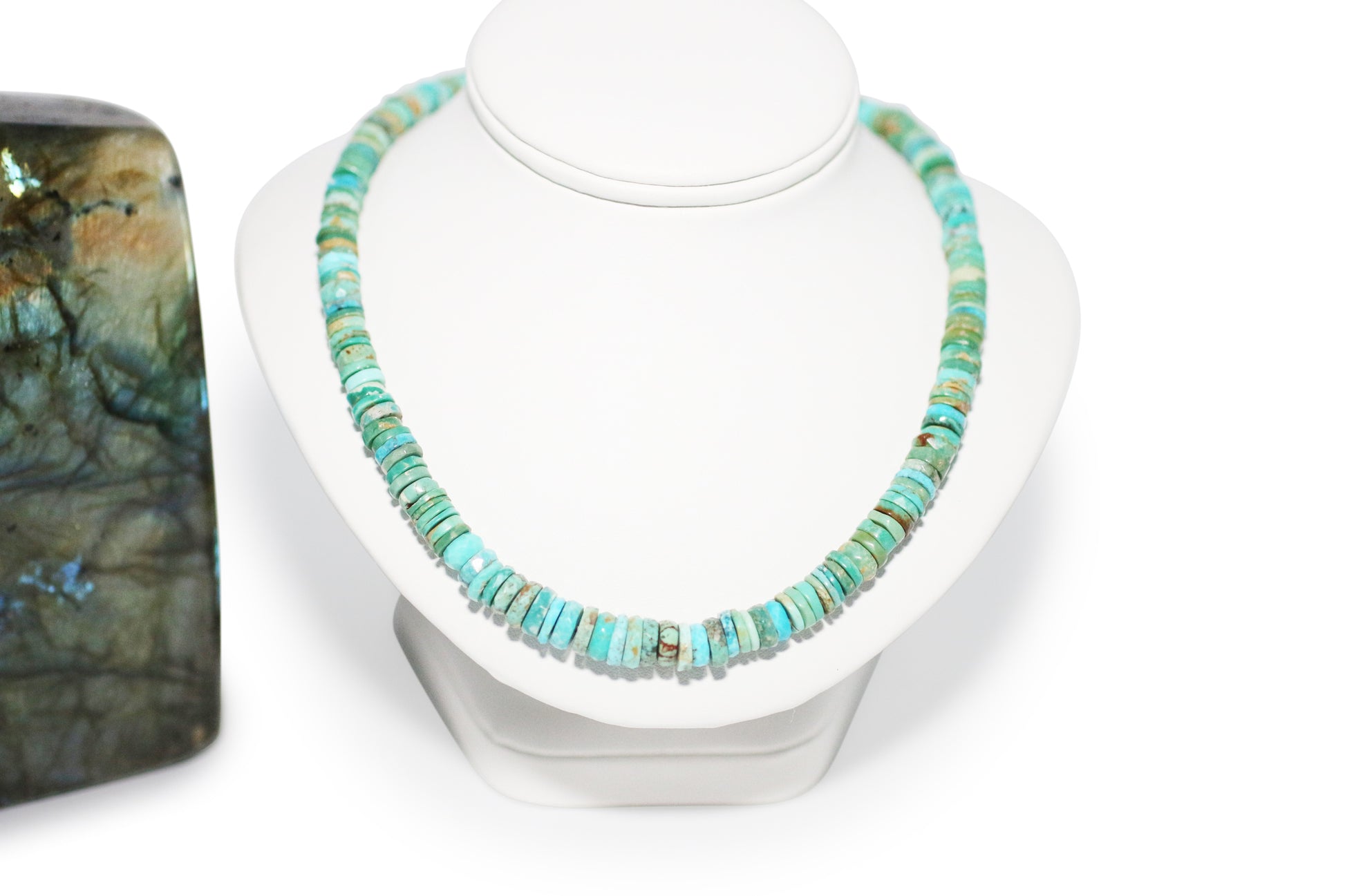 Set your wardrobe apart with this stunning turquoise necklace. Crafted with sterling silver components and a 4" extender, this necklace is both elegant and versatile. Whether you're dressing up for a night out or adding a touch of color to a casual look, this necklace is the perfect accessory to elevate any outfit. Its graduated rondelles add a unique and eye-catching touch, making this necklace a must-have in your jewelry collection.